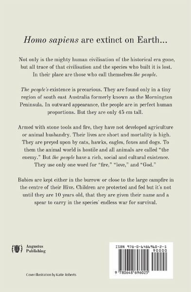 Not only is the mighty human civilisation of the historical era gone, but all trace of that civilisation and the species who built it is lost. In their place are those who call themselves the people. They are in perfect human proportions, but are only 45 cm tall. Armed with stone tools and fire, their lives are short and mortality is high. They are preyed upon by cats, hawks, eagles, foxes and dogs. To them the animal world is hostile and all animals are called "the enemy." But the peoplehave a rich, tribal culture. They use only one word for "fire," "love," and "God." Fire-in-his-hair is a seasoned hunter scarred by the death of his wife. Croaks-with-the-frogs is a young boy who blames himself for the death of his mother. Isolated from the tribe, they are obsessed with searching the swamp to find and kill the cat that killed Fire-in-his-hair's wife. The elders of the tribe order No-point-shoe to bring the the pair back to the fire. Reluctant at first she soon discovers that her efforts to save the outcasts, enhances the life of the whole tribe.