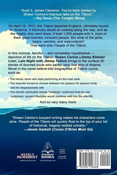 On April 10, 1912, the Titanic departed England, ultimately bound for America. It famously struck an iceberg along the way, and as the mighty ship went down, it took 1,500 people with it, most of them good-hearted, innocent people. But what of the jerks, losers, weirdos, and malcontents? They were also People of the Titanic. In this comical, fanciful- and completely hypothetical - depiction of life on the Titanic, Shawn Carlow (Jimmy Kimmel Live!, Late Night with Jimmy Fallon) brings to the surface 30 stories of doomed souls who sailed upon that ship of dreams. Revel in the never-before-told biographies of Titanic curios, such as: ¿ The heroic mime who kept performing as the boat sank ¿ The importer forced to choose between his passion for passion fruits and his dispassionate wife ¿ The Danish spiritualist whose "readings" confirmed that his rich customers' opulent lifestyles would continue well into the afterlife And so very many more. "Suck it, James Cameron. You've been bested by Shawn Carlow's hilarious take on the Titanic." -Raj Desai (The Tonight Show)