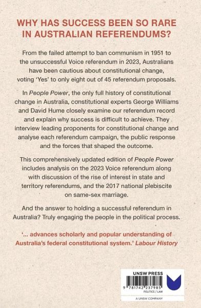 WHY HAS SUCCESS BEEN SO RARE IN AUSTRALIAN REFERENDUMS? From the failed attempt to ban communism in 1951 to the unsuccessful Voice referendum in 2023, Australians have been cautious about constitutional change, voting 'Yes' to only eight out of 45 referendum proposals. In People Power, the only full history of constitutional change in Australia, constitutional experts George Williams and David Hume closely examine our referendum record and explain why success is difficult to achieve. They interview leading proponents for constitutional change and analyse each referendum campaign, the public response and the forces that shaped the outcome. This comprehensively updated edition of People Power includes analysis on the 2023 Voice referendum along with discussion of the rise of interest in state and territory referendums, and the 2017 national plebiscite on same-sex marriage. And the answer to holding a successful referendum in Australia? Truly engaging the people in the political process. 'Essential reading.' - Marcia Langton, Meanjin 'The first of its kind.' - Indigenous Law Bulletin '...advances scholarly and popular understanding of Australia's federal constitutional system.' - Labour History 'A handy reference for teachers and students of Australian history and politics.' - The Age.