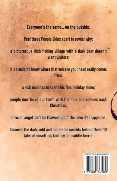 Everyone's the same... on the outside. Peel these People Skins apart to reveal why: a picturesque Irish fishing village with a dark past doesn't want visitors; it's crucial to know where that voice in your head really comes form. a sick man has to spend his final holiday alone; people now leave out teeth with the milk and cookies each Christmas; a frozen angel can't be thawed out of the cave it's trapped in. Uncover the dark, odd and incredible secrets behind these 10 tales of unsettling fantasy and subtle horror.