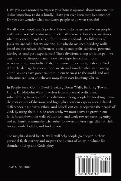 Have you ever wanted to express your honest opinion about someone but didn't know how to do it kindly? Have you ever been hurt by someone? Do you ever wonder what motivates people to do what they do? We all know people aren't perfect, but why do we get mad when people make mistakes? We claim to appreciate differences, but there are times when we expect people to conform to our standards. As followers of Jesus, we are told that we are one, but why do we keep building walls based on our cultural differences, social issues, political views, personal ideologies, and past experiences? These divisions, along with the pain we carry and the disappointments we have experienced, can ruin relationships, harm individuals, and, most importantly, dishonor God. After the damage has been done, we sit and wonder what went wrong. Our divisions have the potential to ruin our witness to the world, and our behaviors can turn unbelievers away from ever-knowing Christ. In People Suck, God is Good, Dr. Malcolm Walls Jr. writes from a place of realism and vulnerability, bravely confronts division among people by breaking down the root causes of division, and highlights how our experiences, cultural differences, past hurts, values, and beliefs can easily separate the people of God. By using the Bible, he reveals why we must strive to grow in our faith, break down the walls of division, and work towards creating unity and authentic community with other followers of Jesus regardless of their backgrounds, beliefs, and brokenness. The insights shared by Dr. Walls will help people go deeper in their personal faith journey and inspire the pursuit of unity in Christ for abundant living and God's glory.