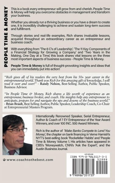All the planning, initiatives, personnel, and invested money are meaningless if a company does not execute and achieve measurable results. This is a book every entrepreneur will grow from and cherish. People, Time & Money will help you overcome obstacles in management and transform your business.  Whether you already run a thriving business or you have a dream to create one, it is incredibly challenging to achieve and sustain long-term success and fulfillment.  Through stories and real-life examples, Rich shares invaluable lessons, acquired throughout an extraordinary career as an entrepreneur and business coach.  With everything from 'The 6 C's of Leadership', 'The 11 Key Components of a Financial Strategy for Growing a Company' and 'Two Years in the Making, One Day at a Time', this book shares vital lessons on the three most important aspects of business success - People, Time, and Money.  People, Time & Money is full of thought-provoking insights and ideas that you can immediately put into action!