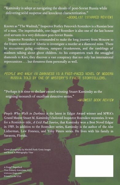 After a very long absence, Forge is delighted to be bringing back one of Edgar-Award winning Stuart Kaminsky's best loved characters, Inspector Porfiry Petrovich Rostnikov. Rostnikov is a Russian bear of a man, an honest policeman in a very dishonest post-Soviet Russia. Known as "The Washtub," Rostnikov is one of the most engaging and relevant characters in crime fiction, a sharp and caring policeman as well as the perfect tour guide to a changing (that is, disintegrating) Russia. Surviving pogroms and politburos, he has solved crimes, mostly in spite of the powers that rule his world. In People Who Walk in Darkness, Rostnikov travels to Siberia to investigate a murder at a diamond mine, where he discovers an old secret...and an even older personal problem. His compatriots head to Kiev on a trail of smuggled diamonds and kidnapped guest workers, and what they discover leads them to a vast conspiracy that not only has international repercussions but threatens them on a very personal level. People Who Walk in Darkness is a fast-paced novel of modern Russia told by one of mystery's finest storytellers.