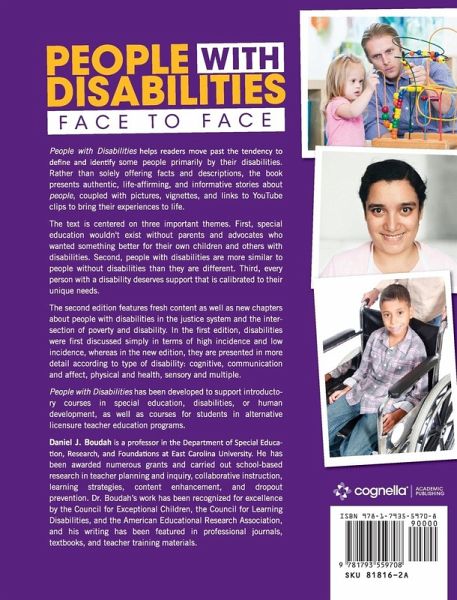 People with Disabilities helps readers move past the tendency to define and identify some people primarily by their disabilities. Rather than solely offering facts and descriptions, the book presents authentic, life-affirming, and informative stories about people, coupled with pictures, vignettes, and links to YouTube clips to bring their experiences to life. The text is centered on three important themes. First, special education wouldn't exist without parents and advocates who wanted something better for their own children and others with disabilities. Second, people with disabilities are more similar to people without disabilities than they are different. Third, every person with a disability deserves support that is calibrated to their unique needs. The second edition features fresh content as well as new chapters about people with disabilities in the justice system and the intersection of poverty and disability. In the first edition, disabilities were first discussed simply in terms of high incidence and low incidence, whereas in the new edition, they are presented in more detail according to type of disability: cognitive, communication and affect, physical and health, sensory and multiple. People with Disabilities has been developed to support introductory courses in special education, disabilities, or human development, as well as courses for students in alternative licensure teacher education programs.