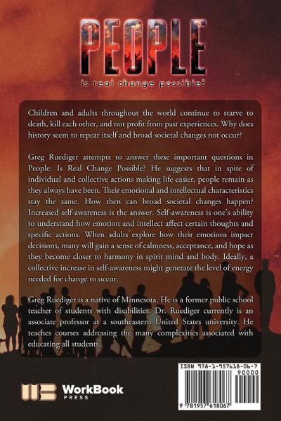 Children and adults throughout the world continue to starve to death, kill each other, and not profit from past experiences. Why does history seem to repeat itself and broad societal changes not occur? Greg Ruediger attempts to answer these important questions in People: Is Real Change Possible? He suggests that in spite of individual and collective actions making life easier, people remain as they always have been. Their emotional and intellectual characteristics remain the same. How then can broad societal changes happen? Increased self-awareness is the answer. Self-awareness is one's ability to understand how emotion and intellect affect certain thoughts and specific actions. When adults explore how their emotions impact decisions, many will gain a sense of calmness, acceptance, and hope as they become closer to harmony in spirit mind and body. Ideally, a collective increase in self-awareness might generate the level of energy needed for change to occur.