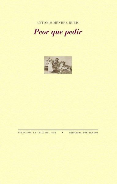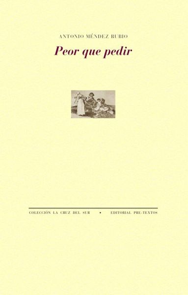 El cineasta Jean-Luc Godard defendía el desafío no de hacer películas políticas sino de hacerlas políticamente. Desde esa inquietud crítica, Peor que pedir busca abrir espacios mínimos, cuánticos, donde la forma de la escritura se oriente hacia una poética de exploración en un mundo dañado. El título juega con una actualización lírica de uno de los dibujos con los que Francisco de Goya preparaba su serie de estampas Desastres de la guerra (1812). Poemas, frases y palabras, se buscan así cruzando intervalos de silencio y vacío para, desde ahí, hacerse la pregunta por la tensión del sentido.