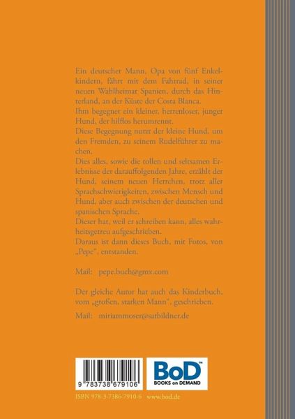 Ein deutscher Mann, Opa von fünf Enkelkindern, fährt mit dem Fahrrad in seiner neuen Wahlheimat Spanien durch das Hinterland, an der Küste der Costa Blanca.Ihm begegnet ein kleiner, herrenloser, junger Hund, der hilflos herumrennt.Diese Begegnung nutzt der kleine Hund, um den Fremden zu seinem Rudelführer zu machen.Dies alles sowie die tollen und seltsamen Erlebnisse der darauffolgenden Jahre erzählt der Hund seinem neuen Herrchen, trotz aller Sprachschwierigkeiten zwischen Mensch und Hund, aber auch zwischen der deutschen und spanischen Sprache.Dieser hat, weil er schreiben kann, alles wahrheitsgetreu aufgeschrieben.Daraus ist dann dieses Buch, mit Fotos, von "Pepe" entstanden.Mail: miriammoser@satbildner.deDer gleiche Autor hat auch das Kinderbuch vom "großen, starken Mann" geschrieben.