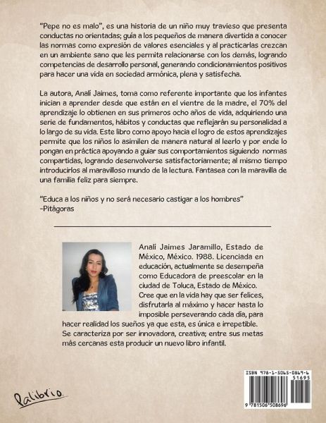 "Pepe no es malo", es una historia de un niño muy travieso que presenta conductas no orientadas; guía a los pequeños de manera divertida a conocer las normas como expresión de valores esenciales y al practicarlas crezcan en un ambiente sano que les permita relacionarse con los demás, logrando competencias de desarrollo personal, generando condicionamientos positivos para hacer una vida en sociedad armónica, plena y satisfecha. La autora, Analí Jaimes, toma como referente importante que los infantes inician a aprender desde que están en el vientre de la madre, el 70% del aprendizaje lo obtienen en sus primeros ocho años de vida, adquiriendo una serie de fundamentos, hábitos y conductas que reflejarán su personalidad a lo largo de su vida. Este libro como apoyo hacia el logro de estos aprendizajes permite que los niños lo asimilen de manera natural al leerlo y por ende lo pongan en práctica apoyando a guiar sus comportamientos siguiendo normas compartidas, logrando desenvolverse satisfactoriamente; al mismo tiempo introducirlos al maravilloso mundo de la lectura. Fantasea con la maravilla de una familia feliz para siempre. "Educa a los niños y no será necesario castigar a los hombres" -Pitágoras