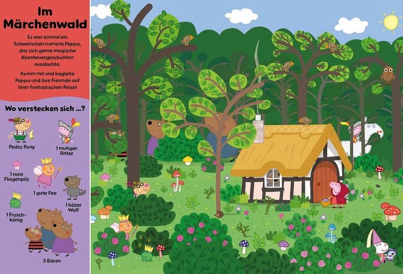 Begleite Peppa und Schorsch bei einem magischen Wimmelabenteuer! Zwischen zauberhaften Feen, mächtigen Dinosauriern, Drachen und Einhörnern gibt es viele spannende Dinge zu entdecken. Aber wo steckt eigentlich Peppa? Findest du sie auf jeder Seite?