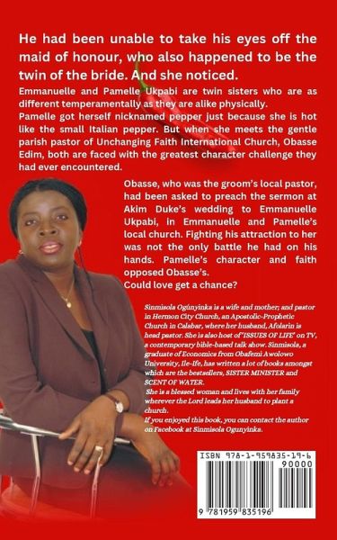 He had been unable to take his eyes off the maid of honour, who also happened to be the twin of the bride. And she noticed. Emmanuelle and Pamelle Ukpabi are twin sisters who are as different temperamentally as they are alike physically. Pamelle got herself nicknamed pepper just because she is hot like the small Italian pepper. But when she meets the gentle parish pastor of Unchanging Faith International Church, Obasse Edim, both are faced with the greatest character challenge they had ever encountered. Obasse, who was the groom's local pastor, had been asked to preach the sermon at Akim Duke's wedding to Emmanuelle Ukpabi, in Emmanuelle and Pamelle's local church. Fighting his attraction to her was not the only battle he had on his hands. Pamelle's character and faith opposed Obasse's. Could love get a chance?