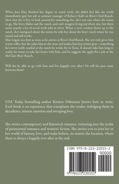 When Joni Kley finished her degree in social work, she didn't feel like she could immediately quit her job as assistant manager of Kelsey's Kafé on River's End Ranch. Now that she is free to look around for something else, she's not sure where she wants to go. She loves Idaho and the ranch, and can't imagine living anywhere else, but there aren't exactly a lot of social work jobs in town. When a new cowboy shows up at the ranch, she's intrigued about the stories he tells her about the boys' ranch where he was raised and still works. Max Logan sees Joni as soon as he arrives at River's End Ranch. She not only gives him warm coffee, but she takes him to the store and makes him buy winter gear—something he's never really needed at the ranch he works for in Texas. It doesn't take him long to realize he wants to take her home with him, and he suggests she apply for a job at the McClain Boys' Ranch. Will she be able to go with him and live happily ever after? Or will his past come between them?