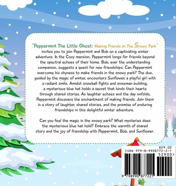 "Peppermint The Little Ghost: Making Friends at The Snowy Park" invites you to join Peppermint and Bob on a captivating winter adventure. In the Cozy mansion, Peppermint longs for friends beyond the spectral echoes of their home. Bob, ever the understanding companion, suggests a quest for new friendships. Can Peppermint overcome his shyness to make friends in the snowy park? The duo, guided by the magic of winter, encounters Sunflower, a playful girl with a radiant smile. Amidst snowball fights and snowman building, a mysterious blue hat holds a secret that binds their hearts through shared stories. As laughter echoes and the day unfolds, Peppermint discovers the enchantment of making friends. Join them in a story of laughter, shared stories, and the promise of enduring friendships in this delightful winter adventure. Can you feel the magic in the snowy park? What mysteries does the mysterious blue hat hold? Embrace the warmth of shared story and the joy of friendship with Peppermint, Bob, and Sunflower.