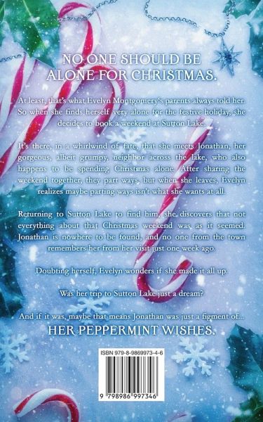 No one should be alone for Christmas. At least, that's what Evelyn Montgomery's parents always told her. So when she finds herself very alone for the festive holiday, she decides to book a weekend at Sutton Lake. It's there, in a whirlwind of fate, that she meets Jonathan, her gorgeous, albeit grumpy, neighbor across the lake, who also happens to be spending Christmas alone. After sharing the weekend together, they part ways, but when she leaves, Evelyn realizes maybe parting ways isn't what she wants at all. Returning to Sutton Lake to find him, she discovers that not everything about that Christmas weekend was as it seemed. Jonathan is nowhere to be found, and no one from the town remembers her from her visit just one week ago. Doubting herself, Evelyn wonders if she made it all up. Was her trip to Sutton Lake just a dream? And if it was, maybe that means Jonathan was just a figment of her peppermint wishes.