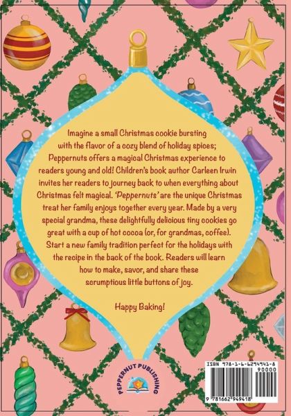 Imagine a small Christmas cookie bursting with the flavor of a cozy blend of holiday spices; Peppernuts offers a magical Christmas experience to readers young an old! Children's book author Carleen Irwin invites her readers to journey back to when everything about Christmas felt magical. 'Peppernuts' are the unique Christmas treat her family enjoys together every year. Made by a very special grandma, these delightfully delicious tiny cookies go great with a cup of hot cocoa (or, for grandmas, coffee). Start a new family tradition perfect for the holidays with the recipe in the back of the book. Readers will learn how to make, savor, and share these scrumptious little buttons of joy. Happy Baking!