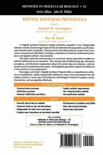 Peptide synthesis has emerged as one of the most powerful tools in biochemical, pharmacological, immunological, and biophysical la- ratories. Recent improvements include general solid-phase method- ogy, new protecting groups, and automated equipment. These advances have allowed the facile synthesis of increasingly more complex p- tides. Many of these new and improved methods for the synthesis of peptides and peptide-related substances have been reported in various publications, but never compiled in a convenient handbook. Like other volumes in this series, Peptide Synthesis Protocols concentrates on the practical aspects of these procedures, providing the researcher with detailed descriptions and helpful tips about potential problems. This volume is not intended to serve as a basic guide to standard Merrifie- type solid-phase strategy, but rather to provide the researcher with some of the most recent applications in the field of peptide science. A c- panion volume, Peptide Analysis Protocols, will detail methodology for the charaterization of new synthetic peptides. Development of new methods and applications has continued actively even as this volume was in preparation. Owing to the number of contributors to this volume, it was necessary to establish a cutoff for publication purposes. We feel that all of the protocols presented are timely and up-to-date. Several promising new strategies, such as allyloxycarbonyl-based syntheses, were being developed at the time this volume was in the editing stages and will be included in future editions.
