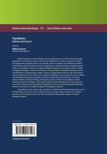 "The editor and co-authors of this volume must be congratulated on a comprehensive collection of very diverse peptidomics protocols that serve as an excellent introduction for a novice in this field. At the same time, the book provides the expert researcher with highly detailed experimental procedures and practical advicefor the analysis of complex mixtures of peptides from a variety of sources. I warmly recommend this book to anyone interested in the field of peptidomics." (Christian A. Olsen, ChemBioChem, Vol. 11, August, 2010)