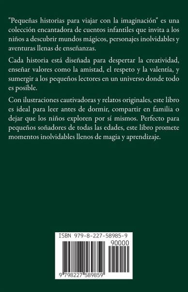 "Pequeñas historias para viajar con la imaginación" es una colección encantadora de cuentos infantiles que invita a los niños a descubrir mundos mágicos, personajes inolvidables y aventuras llenas de enseñanzas. Cada historia está diseñada para despertar la creatividad, enseñar valores como la amistad, el respeto y la valentía, y sumergir a los pequeños lectores en un universo donde todo es posible. Con ilustraciones cautivadoras y relatos originales, este libro es ideal para leer antes de dormir, compartir en familia o dejar que los niños exploren por sí mismos. Perfecto para pequeños soñadores de todas las edades, este libro promete momentos inolvidables llenos de magia y aprendizaje.
