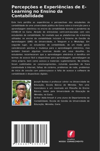Este livro partilha as experiências e perspectivas dos estudantes de contabilidade de uma universidade pública do Gana sobre a transição para a aprendizagem eletrónica no ensino da contabilidade durante a pandemia da COVID-19 no Gana. Através de entrevistas semi-estruturadas com seis estudantes de contabilidade, foi revelado que as plataformas de e-learning utilizadas no ensino da contabilidade incluíam o Sistema de Gestão da Aprendizagem (LMS) da Universidade, o Telegram e o WhatsApp. Em segundo lugar, os estudantes de contabilidade, de um modo geral, consideraram positiva a mudança para a aprendizagem eletrónica, mas também tiveram algumas reservas devido aos seus desafios. Os estudantes reconheceram que a aprendizagem eletrónica é benéfica em termos de acesso fácil a diapositivos para aprendizagem, aprendizagem ao ritmo próprio, bem como acesso a materiais suplementares. No entanto, foram sublinhados os constrangimentos, incluindo questões de fraca conetividade à Internet, falhas do sistema, problemas de rede, problemas de início de sessão com palavra-passe e falta de acesso a software de contabilidade e dispositivos digitais.