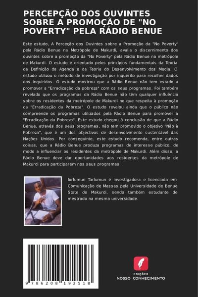 Este estudo, A Perceção dos Ouvintes sobre a Promoção da "No Poverty" pela Rádio Benue na Metrópole de Makurdi, avalia o discernimento dos ouvintes sobre a promoção da "No Poverty" pela Rádio Benue na metrópole de Makurdi. O estudo é orientado pelos princípios fundamentais da Teoria da Definição da Agenda e da Teoria do Desenvolvimento dos Media. O estudo utilizou o método de investigação por inquérito para recolher dados dos inquiridos. O estudo mostrou que a Rádio Benue não tem estado a promover a "Erradicação da pobreza" com os seus programas. Foi também revelado que os programas da Rádio Benue não têm qualquer influência sobre os residentes da metrópole de Makurdi no que respeita à promoção da "Erradicação da Pobreza". O estudo revelou ainda que o público não compreende os programas utilizados pela Rádio Benue para promover a "Erradicação da Pobreza". Este estudo chegou à conclusão de que a Rádio Benue, através dos seus programas, não tem promovido o objetivo "Não à Pobreza", que é um dos objectivos de desenvolvimento sustentável das Nações Unidas. Por conseguinte, este estudo recomenda, entre outras coisas, que a Rádio Benue produza programas de interesse público, de modo a influenciar os residentes da metrópole de Makurdi. Além disso, a Rádio Benue deve dar oportunidades aos residentes da metrópole de Makurdi para participarem nos seus programas.