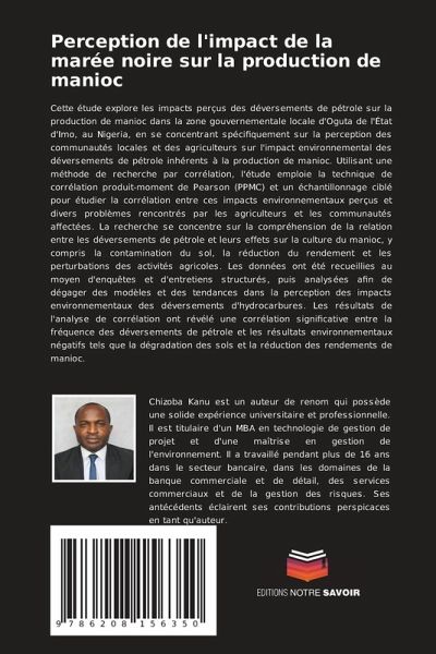 Cette étude explore les impacts perçus des déversements de pétrole sur la production de manioc dans la zone gouvernementale locale d'Oguta de l'État d'Imo, au Nigeria, en se concentrant spécifiquement sur la perception des communautés locales et des agriculteurs sur l'impact environnemental des déversements de pétrole inhérents à la production de manioc. Utilisant une méthode de recherche par corrélation, l'étude emploie la technique de corrélation produit-moment de Pearson (PPMC) et un échantillonnage ciblé pour étudier la corrélation entre ces impacts environnementaux perçus et divers problèmes rencontrés par les agriculteurs et les communautés affectées. La recherche se concentre sur la compréhension de la relation entre les déversements de pétrole et leurs effets sur la culture du manioc, y compris la contamination du sol, la réduction du rendement et les perturbations des activités agricoles. Les données ont été recueillies au moyen d'enquêtes et d'entretiens structurés, puis analysées afin de dégager des modèles et des tendances dans la perception des impacts environnementaux des déversements d'hydrocarbures. Les résultats de l'analyse de corrélation ont révélé une corrélation significative entre la fréquence des déversements de pétrole et les résultats environnementaux négatifs tels que la dégradation des sols et la réduction des rendements de manioc.