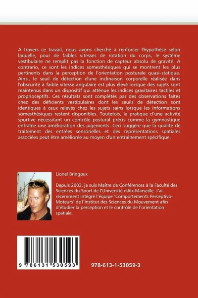 A travers ce travail, nous avons cherché à renforcer l'hypothèse selon laquelle, pour de faibles vitesses de rotation du corps, le système vestibulaire ne remplit pas la fonction de capteur absolu de gravité. A contrario, ce sont les indices somesthésiques qui se montrent les plus pertinents dans la perception de l'orientation posturale quasi-statique. Ainsi, le seuil de détection d'une inclinaison corporelle réalisée dans l'obscurité à faible vitesse angulaire est plus élevé lorsque des sujets sont maintenus dans un dispositif qui atténue les indices gravitaires tactiles et proprioceptifs. Ces résultats sont complétés par des observations faites chez des déficients vestibulaires dont les seuils de détection sont identiques à ceux relevés chez les sujets sains lorsque les informations somesthésiques restent disponibles. Toutefois, la pratique d'une activité sportive nécessitant un contrôle postural précis comme la gymnastique entraîne une amélioration des jugements. Ceci suggère que la qualité de traitement des entrées sensorielles et des représentations spatiales associées peut être améliorée au moyen d'un entraînement spécifique.
