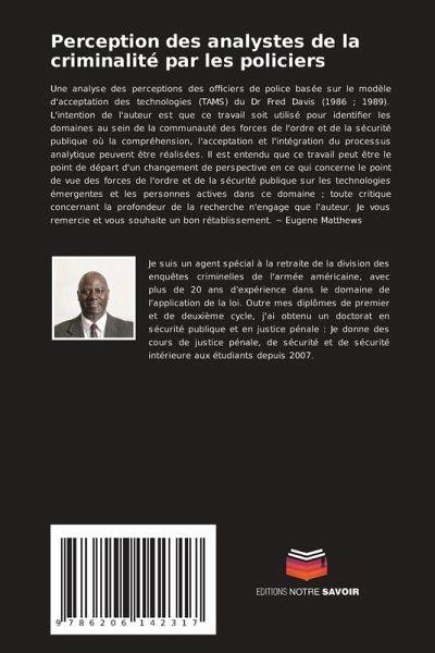 Une analyse des perceptions des officiers de police basée sur le modèle d'acceptation des technologies (TAMS) du Dr Fred Davis (1986 ; 1989). L'intention de l'auteur est que ce travail soit utilisé pour identifier les domaines au sein de la communauté des forces de l'ordre et de la sécurité publique où la compréhension, l'acceptation et l'intégration du processus analytique peuvent être réalisées. Il est entendu que ce travail peut être le point de départ d'un changement de perspective en ce qui concerne le point de vue des forces de l'ordre et de la sécurité publique sur les technologies émergentes et les personnes actives dans ce domaine ; toute critique concernant la profondeur de la recherche n'engage que l'auteur. Je vous remercie et vous souhaite un bon rétablissement. ~ Eugene Matthews