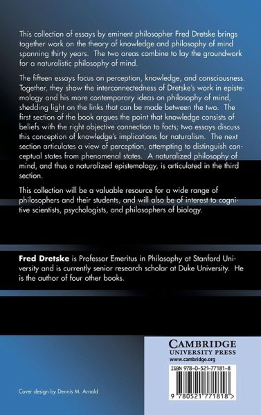This collection of essays by eminent philosopher Fred Dretske brings together work on the theory of knowledge and philosophy of mind spanning thirty years. The two areas combine to lay the groundwork for a naturalistic philosophy of mind. The fifteen essays focus on perception, knowledge, and consciousness. Together, they show the interconnectedness of Dretske's work in epistemology and his more contemporary ideas on philosophy of mind, shedding light on the links which can be made between the two. The first section of the book argues the point that knowledge consists of beliefs with the right objective connection to facts; two essays discuss this conception of knowledge's implications for naturalism. The next section articulates a view of perception, attempting to distinguish conceptual states from phenomenal states. A naturalized philosophy of mind, and thus a naturalized epistemology, is articulated in the third section. This collection will be a valuable resource for a wide range of philosophers and their students, and will also be of interest to cognitive scientists, psychologists, and philosophers of biology.