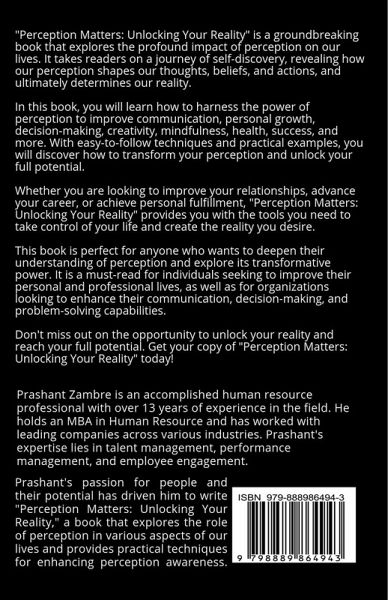 ""Perception Matters: Unlocking Your Reality"" is a groundbreaking book that explores the profound impact of perception on our lives. It takes readers on a journey of self-discovery, revealing how our perception shapes our thoughts, beliefs, and actions, and ultimately determines our reality. In this book, you will learn how to harness the power of perception to improve communication, personal growth, decision-making, creativity, mindfulness, health, success, and more. With easy-to-follow techniques and practical examples, you will discover how to transform your perception and unlock your full potential. Whether you are looking to improve your relationships, advance your career, or achieve personal fulfillment, ""Perception Matters: Unlocking Your Reality"" provides you with the tools you need to take control of your life and create the reality you desire. This book is perfect for anyone who wants to deepen their understanding of perception and explore its transformative power. It is a must-read for individuals seeking to improve their personal and professional lives, as well as for organizations looking to enhance their communication, decision-making, and problem-solving capabilities. Don't miss out on the opportunity to unlock your reality and reach your full potential. Get your copy of ""Perception Matters: Unlocking Your Reality"" today!