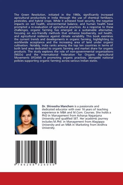 The Green Revolution, initiated in the 1960s, significantly increased agricultural productivity in India through the use of chemical fertilizers, pesticides, and hybrid crops. While it achieved food security, the negative impacts on soil health, environmental balance, and human health have prompted a re-evaluation of agricultural practices. As a response to these challenges, organic farming has emerged as a sustainable alternative, focusing on eco-friendly methods that enhance biodiversity, soil health, and agricultural resilience against climate variability. This book examines the current trends and developments in organic farming, highlighting its worldwide acceptance and the increasing area of land under organic cultivation. Notably, India ranks among the top ten countries in terms of both land area dedicated to organic farming and market share for organic products. The study explores the role of non-governmental organizations (NGOs) and the International Federation for Organic Agricultural Movements (IFOAM) in promoting organic practices, alongside national policies supporting organic farming across various Indian states.