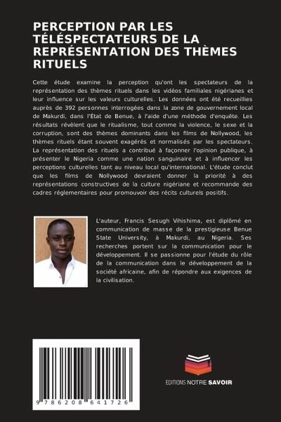 Cette étude examine la perception qu'ont les spectateurs de la représentation des thèmes rituels dans les vidéos familiales nigérianes et leur influence sur les valeurs culturelles. Les données ont été recueillies auprès de 392 personnes interrogées dans la zone de gouvernement local de Makurdi, dans l'État de Benue, à l'aide d'une méthode d'enquête. Les résultats révèlent que le ritualisme, tout comme la violence, le sexe et la corruption, sont des thèmes dominants dans les films de Nollywood, les thèmes rituels étant souvent exagérés et normalisés par les spectateurs. La représentation des rituels a contribué à façonner l'opinion publique, à présenter le Nigeria comme une nation sanguinaire et à influencer les perceptions culturelles tant au niveau local qu'international. L'étude conclut que les films de Nollywood devraient donner la priorité à des représentations constructives de la culture nigériane et recommande des cadres réglementaires pour promouvoir des récits culturels positifs.