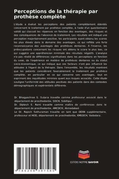L'étude a évalué les perceptions des patients complètement édentés concernant le traitement par prothèse complète, à l'aide d'un questionnaire validé qui classait les réponses en fonction des avantages, des risques et des conséquences de l'absence de traitement. Les résultats ont indiqué une perception majoritairement positive, les participants ayant obtenu les scores les plus élevés dans le domaine des avantages, ce qui reflète une forte reconnaissance des avantages des prothèses dentaires. À l'inverse, les préoccupations concernant les risques ont obtenu le score le plus bas, ce qui suggère une appréhension minimale des résultats négatifs. L'analyse n'a pas révélé de différences significatives dans les perceptions en fonction du sexe, de l'expérience en matière de prothèses dentaires ou du statut socio-économique, ce qui indique que ces facteurs n'ont pas influencé les attitudes à l'égard de la thérapie. Dans l'ensemble, les résultats montrent que les patients considèrent favorablement le traitement par prothèse complète, en particulier en ce qui concerne ses avantages, tout en exprimant des inquiétudes minimes quant aux risques associés. Cette étude souligne l'uniformité des attitudes positives des patients dans des contextes démographiques et expérientiels différents.