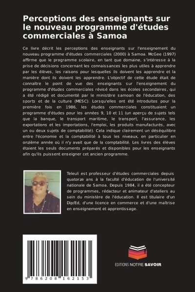 Ce livre décrit les perceptions des enseignants sur l'enseignement du nouveau programme d'études commerciales (2000) à Samoa. McGee (1997) affirme que le programme scolaire, en tant que domaine, s'intéresse à la prise de décisions concernant les connaissances les plus utiles à apprendre par les élèves, les raisons pour lesquelles ils doivent les apprendre et la manière dont ils doivent les apprendre. L'objectif de cette étude était de connaître le point de vue des enseignants sur l'enseignement du programme d'études commerciales révisé dans les écoles secondaires, qui a été rédigé et documenté par le ministère samoan de l'éducation, des sports et de la culture (MESC). Lorsqu'elles ont été introduites pour la première fois en 1986, les études commerciales constituaient un programme d'études pour les années 9, 10 et 11 (un aperçu de sujets tels que la banque, le transport maritime, le transport, l'assurance, les exportations et les importations, l'emploi, les produits manufacturés, avec un ou deux sujets de comptabilité). Cela indique clairement un déséquilibre entre l'économie et la comptabilité à tous les niveaux, en particulier en onzième année où il n'y avait que de la comptabilité. Les livres des élèves étaient les seuls documents préparés et disponibles pour les enseignants afin qu'ils puissent enseigner cet ancien programme.