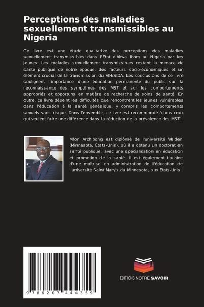 Ce livre est une étude qualitative des perceptions des maladies sexuellement transmissibles dans l'État d'Akwa Ibom au Nigeria par les jeunes. Les maladies sexuellement transmissibles restent la menace de santé publique de notre époque, des facteurs socio-économiques et un élément crucial de la transmission du VIH/SIDA. Les conclusions de ce livre soulignent l'importance d'une éducation permanente du public sur la reconnaissance des symptômes des MST et sur les comportements appropriés et opportuns en matière de recherche de soins de santé. En outre, ce livre dépeint les difficultés que rencontrent les jeunes vulnérables dans l'éducation à la santé génésique, y compris les comportements sexuels sans risque. Dans l'ensemble, ce livre est recommandé à tous ceux qui veulent faire une différence dans la réduction de la prévalence des MST.