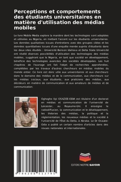 Le livre Mobile Media explore la manière dont les technologies sont adoptées et utilisées au Nigeria, en mettant l'accent sur les étudiants universitaires. Les données qualitatives issues d'entretiens avec des groupes cibles et les données quantitatives issues d'une enquête menée auprès d'étudiants dans les deux sites étudiés : Université Benson Idahosa et Delta State Université ont révélé diverses possibilités d'utilisation des technologies des médias mobiles, suggérant que le Nigeria, en tant que société en développement, bénéficie des technologies avancées des sociétés développées. Les huit chapitres de l'ouvrage ont fait l'objet de recherches approfondies, complétées par les travaux d'autres chercheurs en médias mobiles du monde entier. Ce livre est donc utile aux universitaires et aux chercheurs dans le domaine des médias et de la communication, aux chercheurs sur les médias sociaux, aux étudiants, aux praticiens des médias, aux décideurs en matière de communication et aux amateurs de médias et de communication.