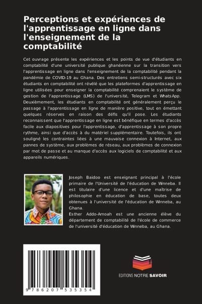 Cet ouvrage présente les expériences et les points de vue d'étudiants en comptabilité d'une université publique ghanéenne sur la transition vers l'apprentissage en ligne dans l'enseignement de la comptabilité pendant la pandémie de COVID-19 au Ghana. Des entretiens semi-structurés avec six étudiants en comptabilité ont révélé que les plateformes d'apprentissage en ligne utilisées pour enseigner la comptabilité comprenaient le système de gestion de l'apprentissage (LMS) de l'université, Telegram et WhatsApp. Deuxièmement, les étudiants en comptabilité ont généralement perçu le passage à l'apprentissage en ligne de manière positive, tout en émettant quelques réserves en raison des défis qu'il pose. Les étudiants reconnaissent que l'apprentissage en ligne est bénéfique en termes d'accès facile aux diapositives pour l'apprentissage, d'apprentissage à son propre rythme, ainsi que d'accès à du matériel supplémentaire. Toutefois, ils ont souligné les contraintes liées à une mauvaise connexion à Internet, aux pannes de système, aux problèmes de réseau, aux problèmes de connexion par mot de passe et au manque d'accès aux logiciels de comptabilité et aux appareils numériques.