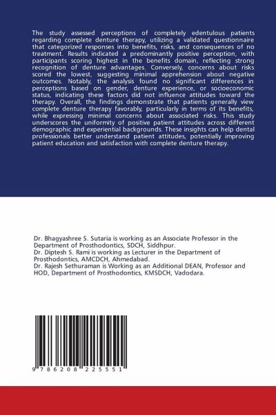 The study assessed perceptions of completely edentulous patients regarding complete denture therapy, utilizing a validated questionnaire that categorized responses into benefits, risks, and consequences of no treatment. Results indicated a predominantly positive perception, with participants scoring highest in the benefits domain, reflecting strong recognition of denture advantages. Conversely, concerns about risks scored the lowest, suggesting minimal apprehension about negative outcomes. Notably, the analysis found no significant differences in perceptions based on gender, denture experience, or socioeconomic status, indicating these factors did not influence attitudes toward the therapy. Overall, the findings demonstrate that patients generally view complete denture therapy favorably, particularly in terms of its benefits, while expressing minimal concerns about associated risks. This study underscores the uniformity of positive patient attitudes across different demographic and experiential backgrounds. These insights can help dental professionals better understand patient attitudes, potentially improving patient education and satisfaction with complete denture therapy.