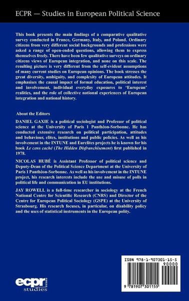 Daniel Gaxie is a political sociologist and Professor of political science at the University of Paris 1 Panthéon-Sorbonne. He has conducted extensive research on political participation, attitudes and behaviour, elites, institutions and public policies. As well as his involvement in the INTUNE and Eurelites projects he is known for his book Le cens caché (The Hidden Disfranchisement) first published in 1978. Nicolas Hubé is Assistant Professor of Political Science and Deputy-Dean of the Political Science Department at the University of Paris 1 Panthéon-Sorbonne. As well as his involvement in the INTUNE project, his research interests include the use and misuse of polls in political life and communication in EU institutions. He has published in Perspectives on European Politics and Society. Jay Rowell is a full-time researcher in sociology at the French National Centre for Scientific Research (CNRS) and director of the Centre for European Political Sociology (GSPE) at the University of Strasbourg. His research focuses in particular on disability policy and the uses of statistical instruments in the European polity. He has recently published, with A Campana and E Henry, La construction des problèmes publics en Europe, Presses Universitaires de Strasbourg, 2007 and with M Mangenot , A political sociology of Europe: Reassessing Constructivism, Manchester University Press, 2010.