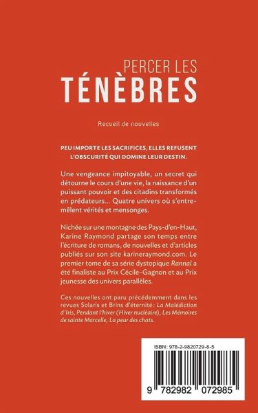 Peu importe les sacrifices, elles refusent l'obscurité qui domine leur destin. Une vengeance impitoyable, un secret qui détourne le cours d'une vie, la naissance d'un puissant pouvoir et des citadins transformés en prédateurs... Quatre histoires où s'entremêlent vérités et mensonges¿: La Malédiction d'Iris, Hiver nucléaire, Les Mémoires de sainte Marcelle, La peur des chats. Ce recueil de nouvelles plonge le lecteur dans des univers où les ténèbres sont aussi physiques que psychologiques, et où chaque personnage tente de percer son propre voile d'illusion pour atteindre la vérité. À PROPOS DE L'AUTRICE Karine Raymond est née en 1978 à Sainte-Agathe-des-Monts. Après un parcours académique orienté vers les langues et les arts, elle hésite longuement entre ces deux disciplines. Elle choisit le DEC en arts plastiques au cégep de Saint-Jérôme et poursuit ses études en design graphique à l'UQAM. Son baccalauréat obtenu, elle travaille d'abord dans une maison d'édition à Montréal, puis devient pigiste. En parallèle, elle suit des cours en littérature à la TÉLUQ et commence à rédiger la série "Rannaï". Nichée sur une montagne des Pays-d'en-Haut, elle explore le concept de résilience alimentaire en aménageant un potager biologique, un jardin de plantes médicinales et une forêt nourricière. Avec l'espoir que sa chienne Nabi et la marmotte lui cèdent une part de récolte, évidemment. Entre deux contrats de graphisme, elle écrit des romans, des nouvelles et des articles publiés sur son site web.
