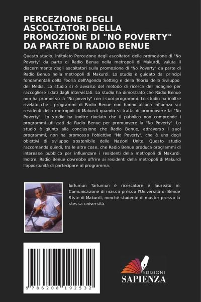 Questo studio, intitolato Percezione degli ascoltatori della promozione di "No Poverty" da parte di Radio Benue nella metropoli di Makurdi, valuta il discernimento degli ascoltatori sulla promozione di "No Poverty" da parte di Radio Benue nella metropoli di Makurdi. Lo studio è guidato dai principi fondamentali della Teoria dell'Agenda Setting e della Teoria dello Sviluppo dei Media. Lo studio si è avvalso del metodo di ricerca dell'indagine per raccogliere i dati dagli intervistati. Lo studio ha dimostrato che Radio Benue non ha promosso la "No poverty" con i suoi programmi. Lo studio ha inoltre rivelato che i programmi di Radio Benue non hanno alcuna influenza sui residenti della metropoli di Makurdi quando si tratta di promuovere la "No Poverty". Lo studio ha inoltre rivelato che il pubblico non comprende i programmi utilizzati da Radio Benue per promuovere la "No Poverty". Lo studio è giunto alla conclusione che Radio Benue, attraverso i suoi programmi, non ha promosso l'obiettivo "No Poverty", che è uno degli obiettivi di sviluppo sostenibile delle Nazioni Unite. Questo studio raccomanda quindi, tra le altre cose, che Radio Benue produca programmi di interesse pubblico per influenzare i residenti della metropoli di Makurdi. Inoltre, Radio Benue dovrebbe offrire ai residenti della metropoli di Makurdi l'opportunità di partecipare al programma.