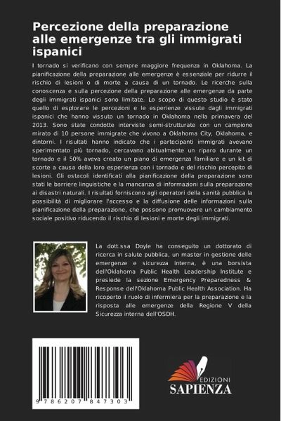 I tornado si verificano con sempre maggiore frequenza in Oklahoma. La pianificazione della preparazione alle emergenze è essenziale per ridurre il rischio di lesioni o di morte a causa di un tornado. Le ricerche sulla conoscenza e sulla percezione della preparazione alle emergenze da parte degli immigrati ispanici sono limitate. Lo scopo di questo studio è stato quello di esplorare le percezioni e le esperienze vissute dagli immigrati ispanici che hanno vissuto un tornado in Oklahoma nella primavera del 2013. Sono state condotte interviste semi-strutturate con un campione mirato di 10 persone immigrate che vivono a Oklahoma City, Oklahoma, e dintorni. I risultati hanno indicato che i partecipanti immigrati avevano sperimentato più tornado, cercavano abitualmente un riparo durante un tornado e il 50% aveva creato un piano di emergenza familiare e un kit di scorte a causa della loro esperienza con i tornado e del rischio percepito di lesioni. Gli ostacoli identificati alla pianificazione della preparazione sono stati le barriere linguistiche e la mancanza di informazioni sulla preparazione ai disastri naturali. I risultati forniscono agli operatori della sanità pubblica la possibilità di migliorare l'accesso e la diffusione delle informazioni sulla pianificazione della preparazione, che possono promuovere un cambiamento sociale positivo riducendo il rischio di lesioni e morte degli immigrati.