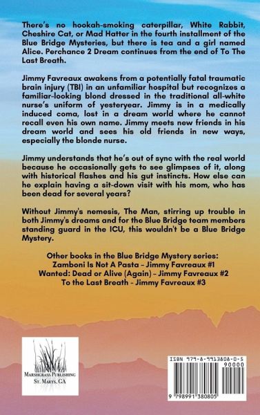 There's no hookah-smoking caterpillar, White Rabbit, Cheshire Cat, or Mad Hatter, but there is tea and a girl named Alice in the fourth installment of the Blue Bridge Mysteries. Perchance 2 Dream picks up where To The Last Breath left off. Jimmy Favreaux has suffered a life-threatening traumatic brain injury (TBI) and wakes up in an unfamiliar hospital but with a familiar-looking blond nurse dressed in the traditional all-white nurse's uniform. This story has two Wendi's, two Pepé's, and two Hillary's, but only one Jimmy, and he's trapped in a dreamworld inside a medically induced coma, unable to remember his own name. Jimmy makes new friends in his dreams and sees his old friends in new ways. Together with the blonde nurse, Jimmy gets tangled up in and then unravels some local mysteries. From occasional glimpses, flashes, and intuitive feelings, Jimmy knows things are out of sync around him, including having a sit-down visit with his mom, who has been dead for several years. It wouldn't be a Blue Bridge Mystery without Jimmy's nemesis, The Man, causing trouble-for Jimmy in his dreams and for the team watching over him in the ICU.