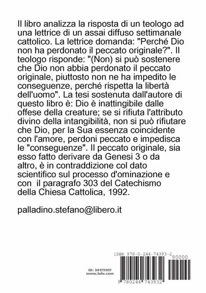 Il libro analizza la risposta di un teologo ad una lettrice di un assai diffuso settimanale cattolico. La lettrice domanda: "Perché Dio non ha perdonato il peccato originale?". IL teologo risponde: "(Non) si può sostenere che Dio non abbia perdonato il peccato originale, piuttosto non ne ha impedito le conseguenze". La tesi sostenuta dall'autore di questo libro è: Dio è inattingibile dalle offese delle sue creature; se si rifiuta l'attributo divino della inattingibilità, non si può rifiutare che Dio, per la Sua essenza coincidente con l'amore, perdoni peccato e le sue "conseguenze". Il peccato originale, sia esso fatto derivare da Genesi 3 o da altro, contraddice il dato scientifico sul processo d'ominazione e il paragrafo 303 del Catechismo della Chiesa Cattolica, 1992. palladino.stefano@libero.it