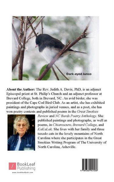 The Rev. Judith A. Davis, PhD, is an adjunct Episcopal priest at St. Philip's Church and an adjunct professor at Brevard College, both in Brevard, NC. As an artist and poet, and avid birder, she has exhibited paintings and photographs in juried venues, and has published poems in regional journals. She lives with her family and three tuxedo cats in the NC mountains.