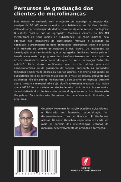 Este estudo foi realizado com o objetivo de investigar o impacto dos serviços da BG MFI sobre os meios de subsistência das famílias clientes, utilizando uma combinação de dados transversais e de séries cronológicas. O estudo concluiu que os agregados familiares clientes da BG MFI melhoraram os seus meios de subsistência, tal como indicado pela alteração dos indicadores de subsistência relativos à qualidade da habitação, à propriedade de bens domésticos importantes (fixos e móveis) e à melhoria do volume de negócios e dos lucros. Os resultados da investigação mostram também que os agregados familiares ¿muito pobres¿ beneficiaram mais do programa de microfinanciamento na construção de activos domésticos importantes do que os seus homólogos ¿não tão pobres¿. Além disso, verificou-se que existem vários percursos socioeconómicos ou de graduação da pobreza, consoante os agregados familiares sejam muito pobres ou não tão pobres. A melhoria dos meios de subsistência para os clientes muito pobres é mais de activos, enquanto que os clientes não tão pobres melhoraram o seu volume de negócios (mesmo que a mudança marginal não seja significativamente elevada). Isto indica que a IMF BG tem um efeito de criação de valor muito forte sobre os meios de subsistência dos clientes muito pobres do que sobre os dos clientes não tão pobres. Os clientes não tão pobres têm benefícios muito limitados do programa.