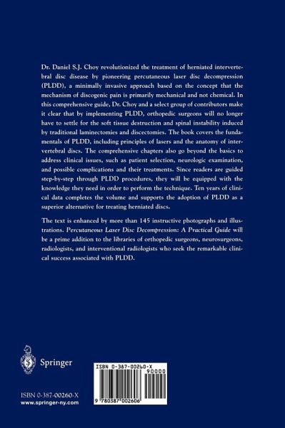 Percutaneous laser disc decompression (PLDD) is an entirely new approach to the treatment of herniated intervertebral disc d- ease. The traditional laminectomy and discectomy procedure was first performed at the Massachusetts General Hospital in 1934. In the intervening 69 years, science has moved forward with m- netic resonance imaging, sequencing of the human genome, ion propulsion, landing men on the moon and robots on Mars, the laptop computer, global positioning system navigation, black hole theory, string theory, and the successful cloning of animals. And yet, the same soft tissue destroying, scar-inducing, pos- rior wall weakening, and spinal instability inducing cutting - eration is still being taught and performed. Advances in ort- pedics and neurosurgery occur slowly. Percutaneous laser disc decompression is minimally invasive; it can be performed as an outpatient procedure, requires no g- eral anesthesia, and has a high success rate, a low recurrence rate, and a low complication rate. By the middle of 2002, some 35,000 PLDD procedures had been performed worldwide. This book covers the history of the development of PLDD, laser physics, anatomy and pathophysiology of the herniated disc, the physics and mechanical principles that form the basis of PLDD, patient selection, radiographic considerations, the neurologic - amination, a step-by-step description of the PLDD procedure, the complications of PLDD and their treatments, special cases amenable to PLDD, postoperative care, and rehabilitation pro- dures. In short, this is a compendium of PLDD from A to Z.