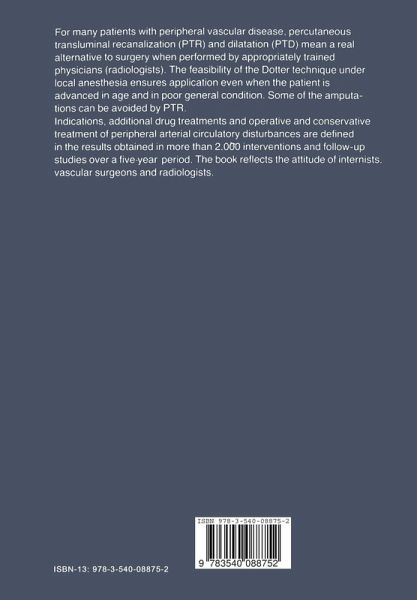 1. Introduction.- I. Technique.- 2. Transluminal Angioplasty - Pathologic Basis.- 3. Transluminal Dilatation With Separate Teflon Catheters.- 4. Percutaneous Transluminal Recanalization (PTR) With the Double-Lumen Dilatation Catheter.- 5. Dilatation Technique of Iliac Artery Stenoses With Balloon Catheters.- 6. Transluminal Vascular Dilatation With a Modified Dilatation Catheter.- II. Histologic Experiences.- 7. Histopathologic Aspects of Transluminal Recanalization.- 8. Morphologic Alterations After Percutaneous Transluminal Recanalization of Chronic Femoral Atherosclerosis.- III. Experimental Studies.- 9. Transluminal Dilatation of Coronary Artery Stenosis - Experimental Report.- 10. Percutaneous Transluminal Dilatation (PTD) of Carotid Artery Stenosis.- IV. Medical Treatment.- 11. Drug Treatment Before and After PTR.- V. Monitoring Methods.- 12. Ultrasound Techniques for Follow-Up of Hemodynamic Changes After Transluminal Dilatation or Recanalization.- 13. Transvenous Xeroarteriography, an Appropriate Method for Angiographic Follow-Up After PTR.- VI. Results of PTR.- 14. Review of the Results of the Dotter Procedure.- 15. Late Results of Percutaneous Catheter Treatment (Dotter's Technique) in Occlusion of the Femoropopliteal Arteries, Stage II.- 16. Early and Late Results of PTD in Iliaca Stenosis.- 17. Cooperative Study of Results of PTR in Twelve Different Clinics.- VII. Complications.- 18. Complications In and After PTR.- 19. Complications of the Transluminal Angioplasty Excluding the Puncture Site Complications.- VIII. Special Indications.- 20. Transluminal Dilatation of a Stenosis in the Deep Femoral Artery.- 21. Percutaneous Transluminal Dilatation of Stenosis Behind AV-Fistulas in Hemodialysis Patients.- 22. PTR in Iliac Vein Thrombosis.- IX. PTR inCombination With Other Techniques.- 23. Percutaneous Transluminal Recanalization Combined With Fibrinolysis.- 24. Percutaneous Transluminal Recanalization (PTR) and Fibrinolysis: Fibrinolytic Treatment of Femoral Reocclusions Subsequent to PTR Procedures.- 25. Selective Arterial Clot Lysis With Angiography Catheter.- 26. Vascular Surgery and Transluminal Dilatation/Recanalization: Complementary Procedures for the Reconstruction of Peripheral Occlusive Diseases.- 27. Surgical Aspects of Vascular Reconstruction After PTR.- 28. Intraoperative Transluminal Angioplasty by Dotter's Method.- X. Indications.- 29. Indications for PTR From the Angiologic Point of View.- 30. Indications for PTR From the Surgical Point of View.- XI. Summary.- 31. Appraisal of the Techniques.- 32. Appraisal of the Therapy.- References to Chapters 5, 11, 15, 18-22, 24, 25, 28-31.