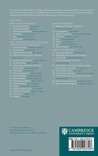 I. Life and Death: 1. Family and education Nora Crook 2. Women and children Daisy Hay 3. Great Britain and Ireland Timothy Heimlich 4. Switzerland Patrick Vincent 5. Italy Valentina Varinelli 6. Byron and Shelley Jacques Khalip Part II. Intellectual, Cultural, and Political Contexts: 7. Ancient philosophy Amanda Blake Davis 8. Ancient poetry Tom Phillips 9. English literature to 1792 Ross Wilson 10. European literature, Dante to Rousseau Diego Saglia 11. The visual and plastic arts Sophie Thomas 12. The radical press Philip Connell 13. Shelley and the lake poets: '-have I not kept the vow?' Eric Lindstrom 14. Mary Shelley Anna Mercer 15. Thomas Love Peacock Joseph Turner 16. The cold worlds of Byron and Shelley Merrilees Roberts 17. Keats and Shelley Anahid Nersessian 18. Revolution and reform Brian McGrath 19. Political economy Paul Stephens 20. Empire Nahoko Miyamoto Alvey 21. Shelley's sexless sexuality Kate Singer 22. The British empiricists Chris Townsend 23. The sciences Andrew Lacey 24. Religion Colin Jager Part III. Writings: 25. Publishing, publishers, and editions Michael Rossington 26. Correspondence Will Bowers 27. Shelley's translations Mathelinda Nabugodi 28. The gothic Jerrold E. Hogle 29. Lyric Alexander Freer 30. Drama Julie Camarda 31. Epic Yasmin Solomonescu 32. Shelley's laughter Matthew Ward Part IV. Afterlives: 33. Contemporary reviews Kim Wheatley 34. Biographers, memoirists, reminiscers 1823-1878 Bysshe Inigo Coffey 35. Global reception and translation Omar F. Miranda 36. 'For the many, not the few': Shelley and politics from Chartism to socialism Casie LeGette 37. The Victorians' Shelley Tom Mole 38. Twentieth-century poetry Madeleine Callaghan 39. Lyric trouble: Shelley and contemporary poetry John Wilkinson 40. Shelley and popular culture Suzanne L. Barnett 41. Shelley: palinode/divagation Maureen N. McLane.