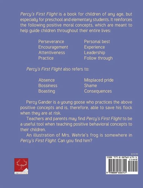 Percy's First Flight is a book for children of any age, but especially for preschool and elementary students. It reinforces the following positive moral concepts, which are meant to help guide children throughout their entire lives: Perseverance Personal best Encouragement Experience Attentiveness Leadership Practice Follow through Percy's First Flight also refers to: Absence Misplaced pride Bossiness Shame Boasting Consequences Percy Gander is a young goose who practices the above positive concepts and is, therefore, able to save his flock when they are at risk. Teachers and parents may find Percy's First Flight to be a useful tool when teaching positive behavioral concepts to their children. An illustration of Mrs. Wehrle's frog is somewhere in Percy's First Flight. Can you find him?