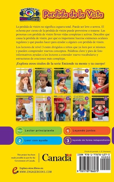La pérdida de visión no significa ceguera total. Puede ser leve o severa. El ochenta por ciento de la pérdida de visión puede prevenirse o tratarse. Las personas con pérdida de visión llevan vidas completas y activas. Descubre qué causa la pérdida de visión, por qué es importante hacerse exámenes oculares regulares y qué puedes hacer para ayudar a alguien con pérdida de visión. Los lectores de nivel 3 están dirigidos a niños que ya leen por sí mismos y pueden comprender nuevos conceptos. Palabras clave y pies de foto informativos ayudan a los lectores a entender nuevo vocabulario y estructuras de oraciones más complejas. Este proyecto ha sido posible en parte gracias al Gobierno de Canadá.