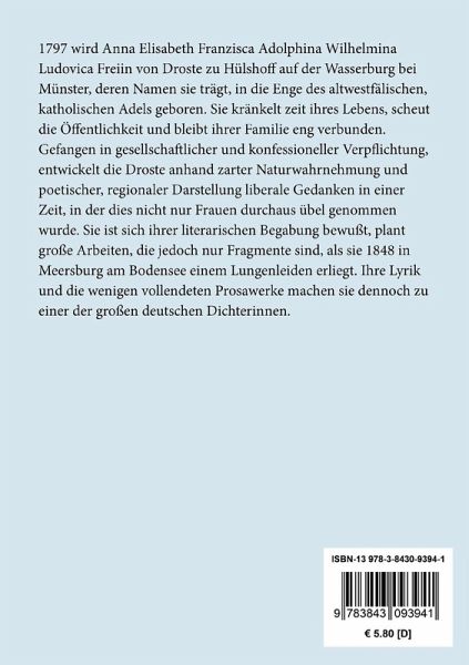 1797 wird Anna Elisabeth Franzisca Adolphina Wilhelmina Ludovica Freiin von Droste zu Hülshoff auf der Wasserburg bei Münster, deren Namen sie trägt, in die Enge des altwestfälischen, katholischen Adels geboren. Sie kränkelt zeit ihres Lebens, scheut die Öffentlichkeit und bleibt ihrer Familie eng verbunden. Gefangen in gesellschaftlicher und konfessioneller Verpflichtung, entwickelt die Droste anhand zarter Naturwahrnehmung und poetischer, regionaler Darstellung liberale Gedanken in einer Zeit, in der dies nicht nur Frauen durchaus übel genommen wurde. Sie ist sich ihrer literarischen Begabung bewußt, plant große Arbeiten, die jedoch nur Fragmente sind, als sie 1848 in Meersburg am Bodensee einem Lungenleiden erliegt. Ihre Lyrik und die wenigen vollendeten Prosawerke machen sie dennoch zu einer der großen deutschen Dichterinnen.